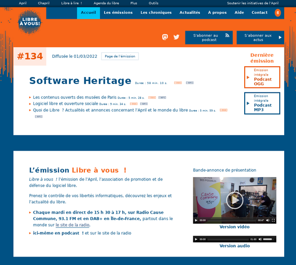 - 8 novembre 2021 : Ouverture de libreavous.org, le site web dédié à l'émission de radio de l'April sur les libertés informatiques