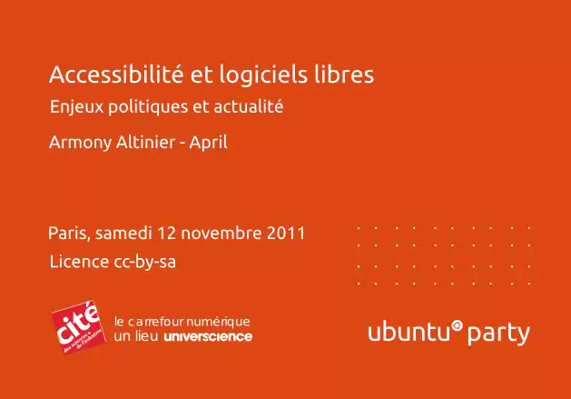 Un exemple, justement pour ces acteurs du handicap, il y a une association importante, deux associations importantes qui organisent une journée d'information sur le tactile. Et en fait, pour sensibiliser au tactile, elles font venir les constructeurs, qui tiennent des stands pour pouvoir essayer. Ben du coup ils n'ont qu'une vision un peu tronquée. Donc nous, on devait intervenir, mais comme on n'a pas de matériel à vendre ou à présenter, on n'aura pas de stand finalement, on est quand même invités à intervenir, pour présenter, voilà, pour faire un peu de relationnel, pour donner des cartes de visites, on est quand même accueillis. Mais on voit que c'est une approche qui, finalement, donne la part belle au marketing de ces entreprises avec une vision un peu tronquée. Donc nous on a un rôle comme ça de sensibiliser ces acteurs et qui sont vraiment curieux et ouverts, donc, aux logiciels libres. Mais souvent ils ne connaissent pas du tout, donc on, nous sommes toujours un peu sceptiques. Ici même à la Cité des Sciences, maintenant c'est quand même récent, mais ils font une formation à NVDA, qui est le concurrent de JAWS. Donc au Carrefour... au Carrefour numérique mais, à la salle Louis Braille, voilà. Il y a un espace juste ici, à côté, où ils aident les personnes en situation de handicap visuel à se servir des technologies d'assistance, et notamment de JAWS. Et puis récemment ils ont ouvert des formations aussi à NVDA, qui est la même chose, en logiciel libre, voilà, sous Windows. Donc pour information, il y a aussi ORCA sous GNU/Linux. Donc notamment sous Ubuntu. Et l'autre pendant, c'est défendre l'accessibilité au sein du monde du Libre. Puisque là, souvent, il y avait, quand même, une méconnaissance globalement. Il y avait des tas de beaux projets, de façon un peu éparpillée, de manière... voilà, des tas de choses qui se faisaient, mais il y avait peu de communication.