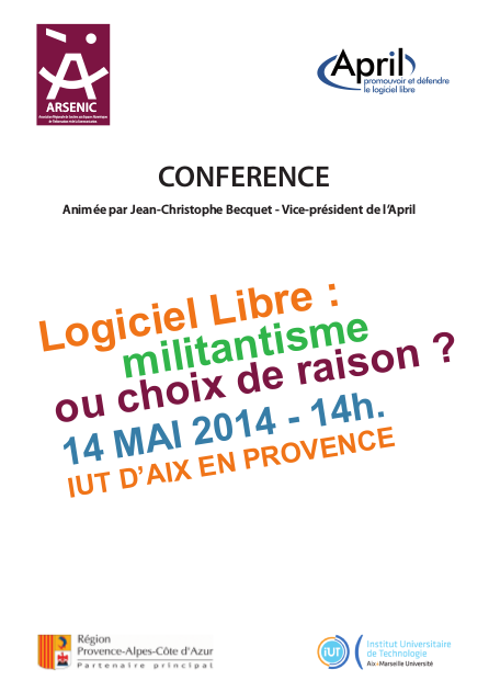 L'association ARSENIC PACA vous invite pour une conférence intitulée « Logiciel libre : militantisme ou choix de raison » animée par Jean-Christophe Becquet, vice-président de l'April, mercredi 14 mai 2014 à 14h à l'IUT d'Aix-en-Provence.