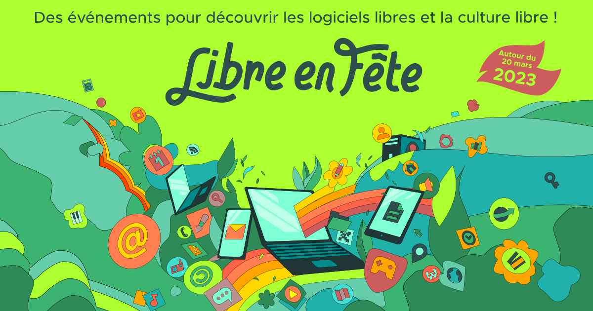 La campagne de mobilisation pour le Libre en Fête est lancée ! Pour la 22e année consécutive, pour accompagner l'arrivée du printemps, toutes les organisations ayant à cœur la promotion du logiciel libre et de la culture libre sont invitées à proposer des événements de découverte autour du 20 mars, dans une dynamique conviviale et festive. L'édition 2023 du Libre en Fête aura lieu du samedi 4 mars au dimanche 2 avril.