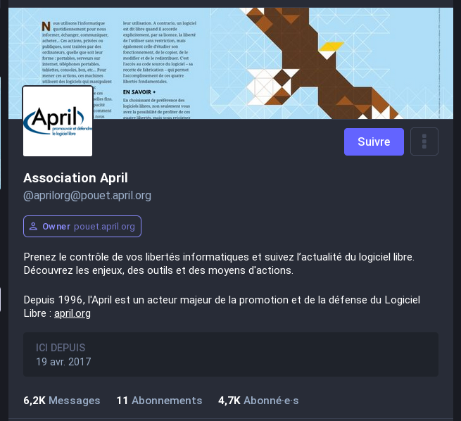 L'April soumet régulièrement des dépêches sur le site pour relayer ses actions et analyses. LinuxFr relaye régulièrement nos campagnes (adhésion ou autres) grâce à des bannières sur le site.