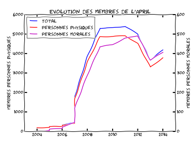 Six ans plus tard, la base de ses adhérents s'est naturellement érodée. De trop nombreux adhérents n'étaient plus à jour de cotisation. C'est un phénomène commun à toutes les structures associatives et qui a pris de l'ampleur chez nous, malgré un important travail de relance. En 2013, nous avions donc mis la liste de nos adhérents à jour afin qu'elle soit plus représentative de la réalité de l'April, en attendant de relancer une campagne d'adhésion. En conséquence, près de 1 200 adhérents non à jour de cotisation avaient été radiés.